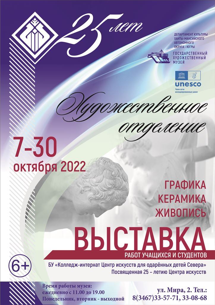 Юные таланты Центра искусств приоткрывают свой взгляд на мир. С 7 октября в Государственном художественном музее в цикле «Музей представляет» начнёт свою работу выставка учащихся и студентов художественного отделения БУ «Колледж-интернат Центр искусств для одарённых детей Севера», посвященная его 25-летию.