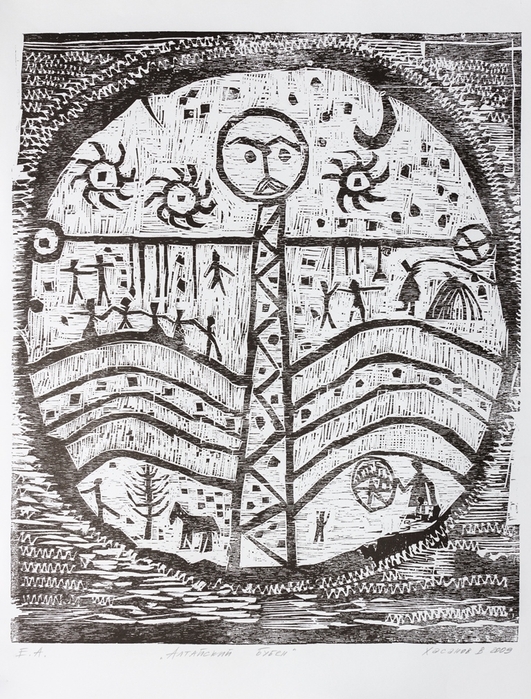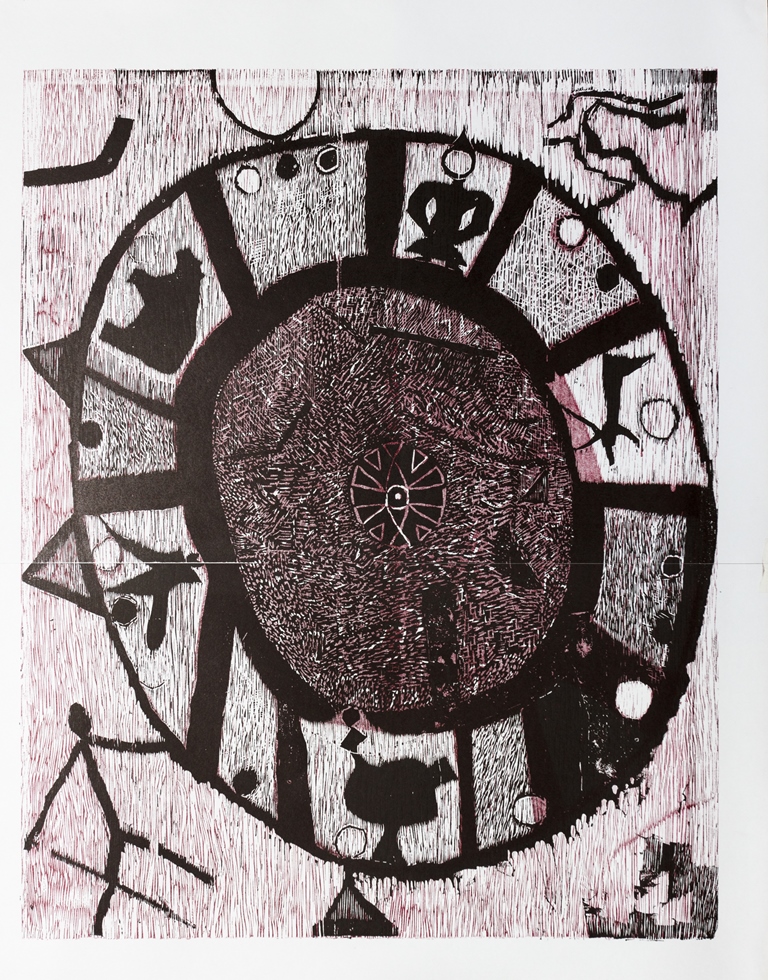 В экспозиции представлена графика периода с 1990-х по 2000-е годы. В основном это работы большого формата, выполненные в различных графических техниках. Отдельное место на выставке занимает серия «Бубны». Художник говорит: «Я много путешествую. И во многих культурах бубен – важный атрибут, как музыкальный инструмент, как магический символ. Поэтому и стал рисовать разные варианты, чтобы разобраться, что это такое».