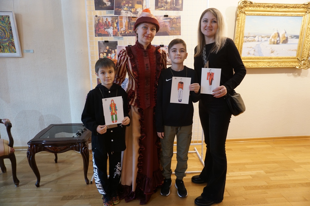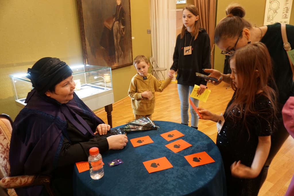 Отважные путешественники побывали в салоне Пиковой дамы, где познакомились с выставкой «Дамские штучки», и создали эскиз костюма в Модном ателье. Нашли ключи, спрятанные в экспонатах выставки фарфора, а в учебном классе мадам Фыр-Фыр сдали экзамен по семьеведению. Подсказки на картинах русских художников привели участников в семейный фотосалон.