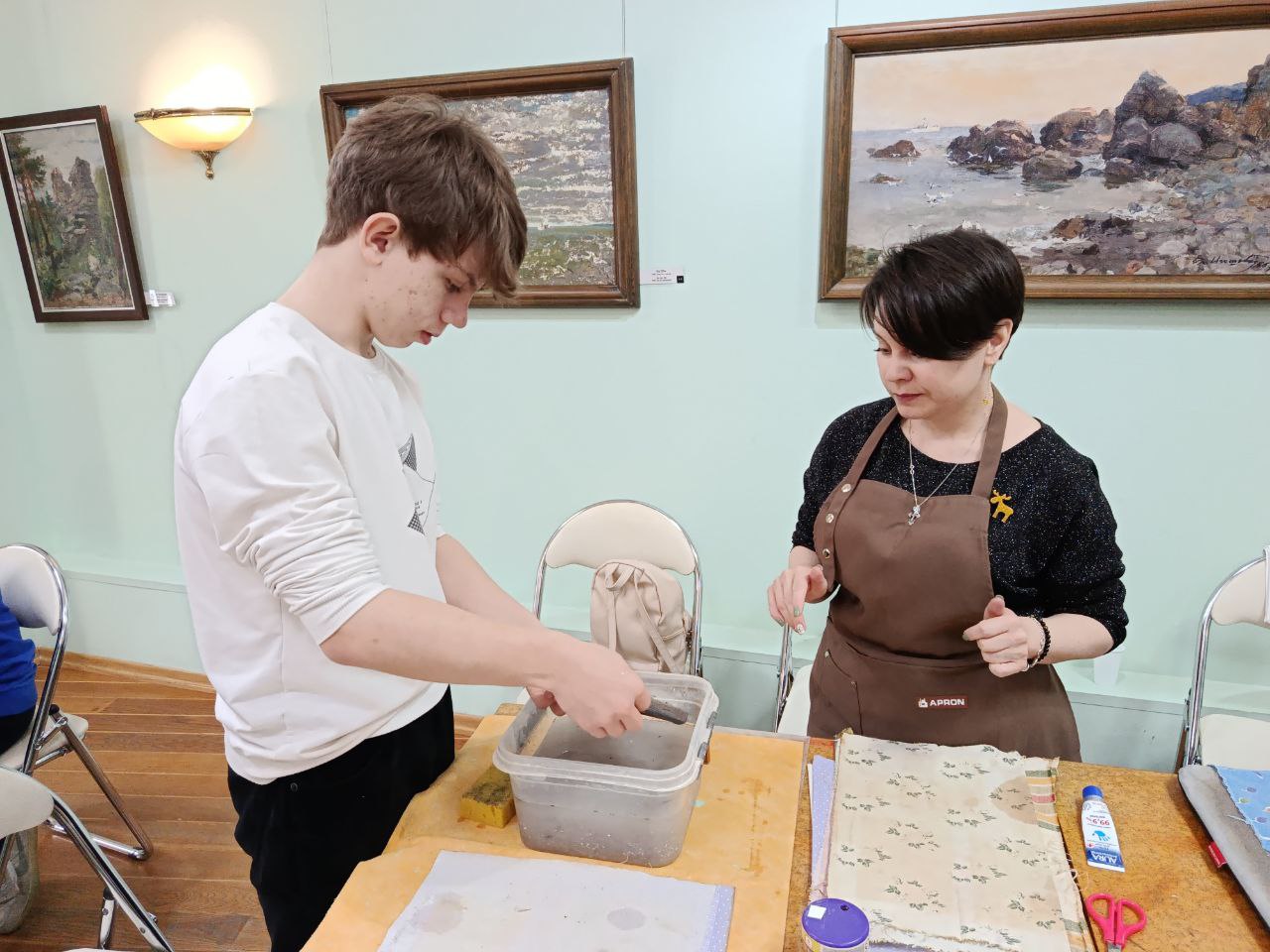Прошли мастер-классы в технике масляной пастели и акварели. Родители и дети делали солдатские пилотки из простой газеты и праздничные поделки из переработанной бумаги.