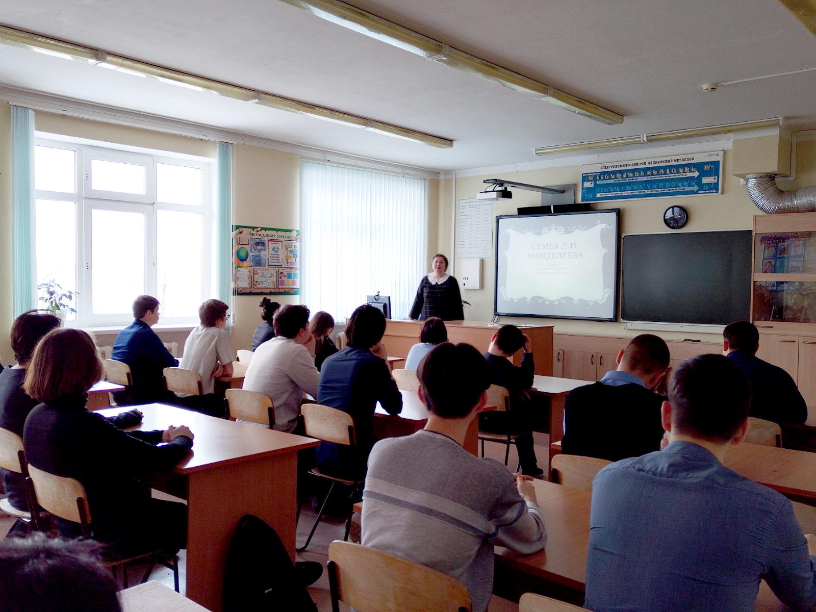Ко Дню российской науки, Году семьи и 190-летию великого русского ученого Дмитрия Ивановича Менделеева были приурочены лекции "Семья Д. И. Менделеева". 7 февраля в десятых классах средней школы № 5 г. Ханты-Мансийска познавательные занятия провела сотрудник ГХМ Югры, заведующая филиалом «Дом-музей народного художника СССР В. А. Игошева» Надежда Сухорукова.