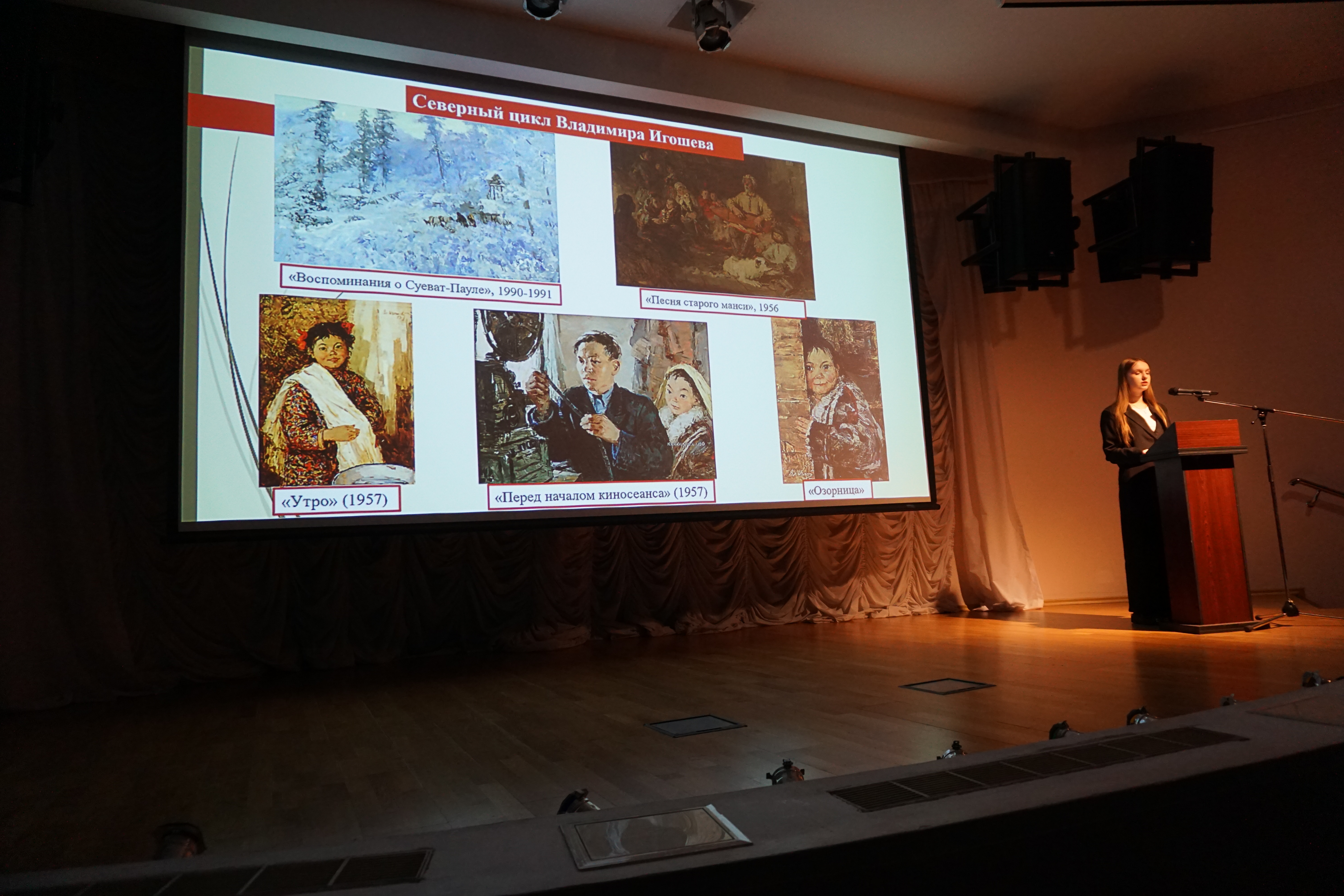 Анна Андрейченко из Городской школы искусств для одаренных детей Севера рассказала о теме Отечественной войны в произведениях фронтовика Владимира Александровича Игошева. Заострила внимание на картинах, что посвящены женщинам на войне и матерям в тылу.