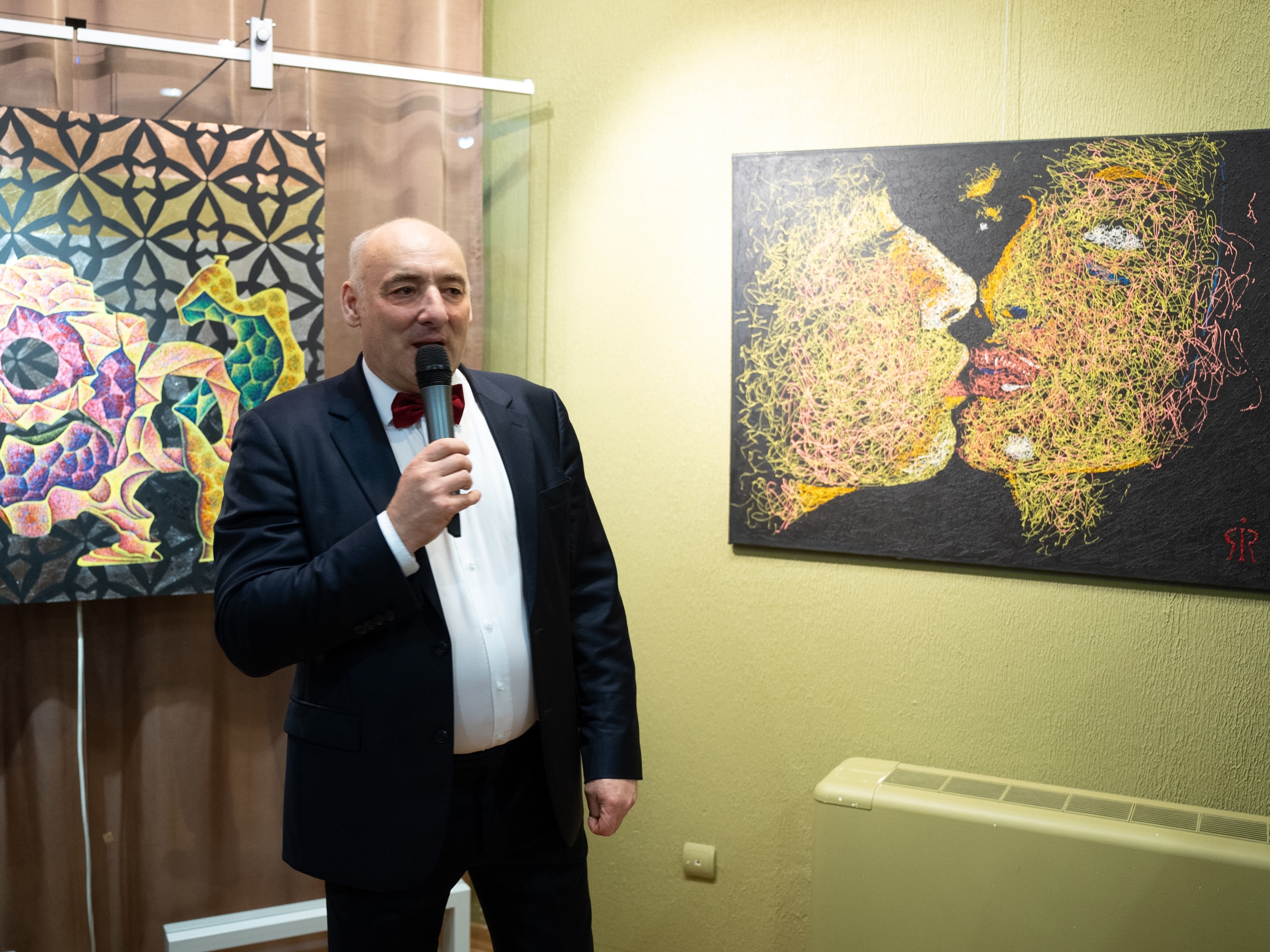 Игорь Рязанцев с большим воодушевлением поблагодарил всех за возможность представить свои работы в Ханты-Мансийске: «Хочу поблагодарить Югру и руководителя региона Руслана Николаевича Кухурака. Говорю слова благодарности заместителю губернатора Елене Майер, с которой дружим много лет. Большая признательность коллективу музея во главе с Еленой Кондрашиной. Мы почти мгновенно, всего за два дня смонтировал выставку. Поверьте, это было очень непросто. Я благодарен всем, кто сегодня пришел на мою выставку. Я постараюсь не разочаровать, а удивить и всех тех, кто еще заглянет в музей. Знаете, филумизм начался не сразу со шприца и акриловых нитей. Сначала это были оргстекло и проволока, и у меня неплохо получалось. Но хотелось чего-то традиционного, работать на холсте, которому тысячи лет. А знаете, из чего акрил делается? Из нашей родной нефти!»