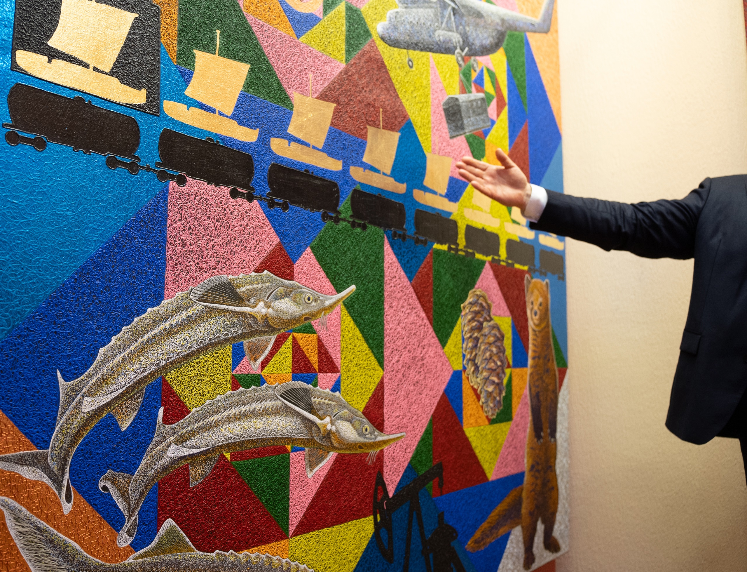 Работы Игоря Рязанцева размещены на двух этажах музея - живописные произведения и масштабные инсталляции. Одна картина была создана специально к открытию выставки. Пока ее рабочее название - «Югра». На картине изображены все богатства автономного округа: соболи, нефтяная вышка, стерлядь, кедровые шишки и орнаменты коренных малочисленных народов Севера.