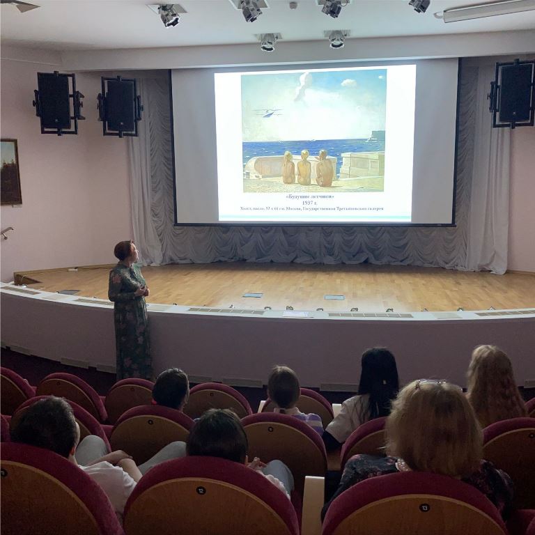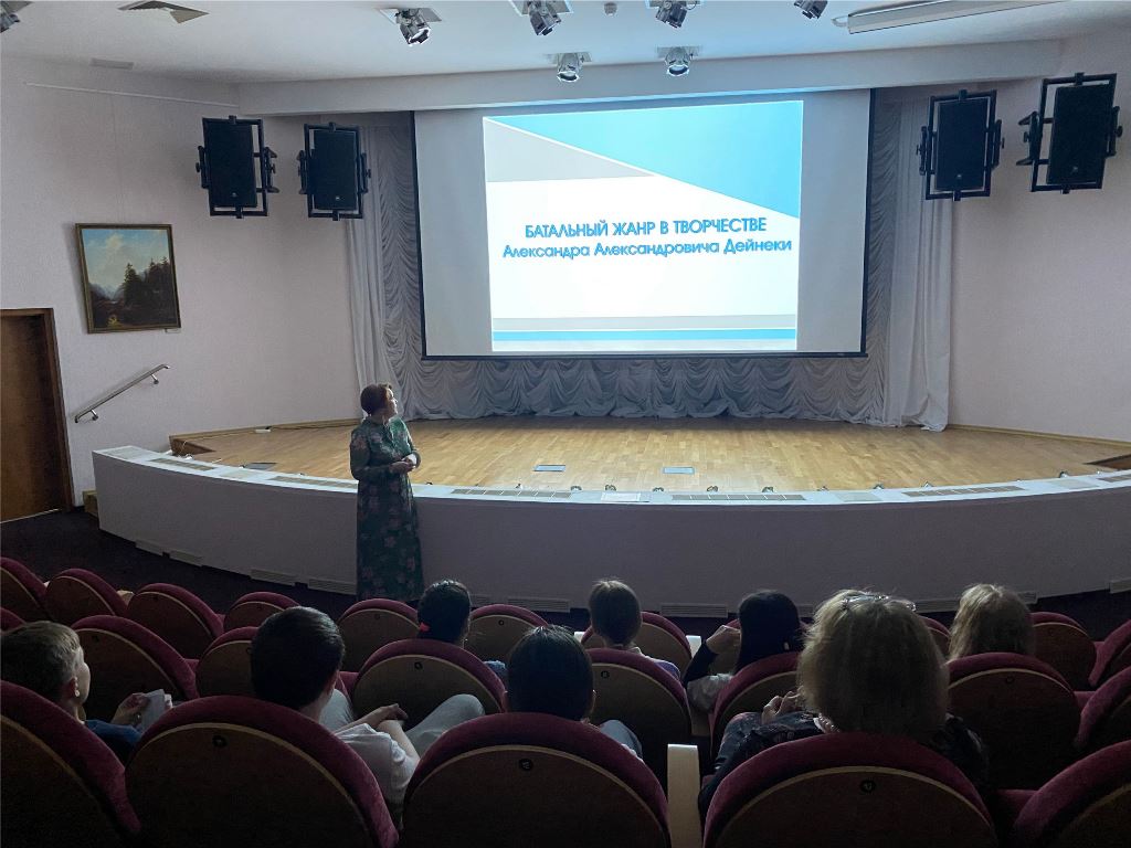 Ученики 5 класса СОШ №1 города Ханты-Мансийска посетили лекцию «Батальный жанр в творчестве А. А. Дейнеки». Просматривая презентацию с произведениями художников-баталистов, ребята познакомились с особенностями жанра. А на примере творчества Александра Дейнеки убедились в том, что искусство ярко и многогранно рассказывает о героизме и доблести, воплощает абстрактные понятия в зримые образы. Об одном из эпизодов Великой Отечественной войны ребята узнали на основе этюда «Высадка десанта» к картине «Оборона Севастополя».