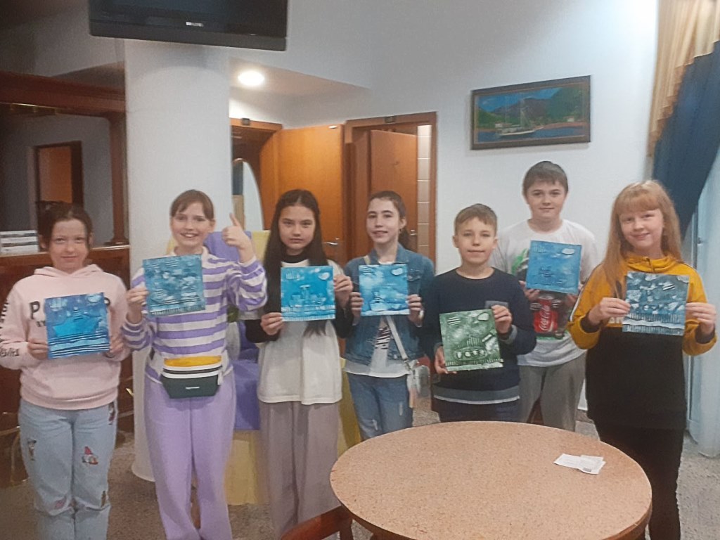 После лекции школьники на творческом мастер-классе «Открытка к 9 мая» выполнили декоративные панно на картоне с изображением военной техники – кораблей и самолетов.