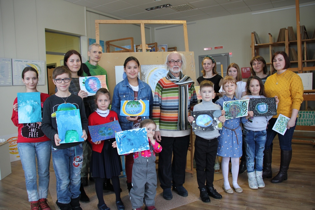 Занятие продолжилось в мастерской художника. Сама обстановка мастерской с запахом краски, живописными произведениями, мольбертами располагала к творческому диалогу. Каждый участник, включая Маэстро, создал свой живописный образ Земли в космическом пространстве. В завершение мастер-класса юные художники услышали важные слова о своих работах от Геннадия Степановича Райшева, для которого важно приобщение молодого поколения к искусству, творчеству.