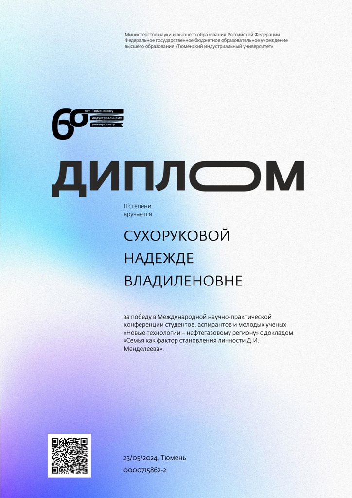 2024 год посвящен Году семьи, также, в этом году отмечается 190-летие Д. И. Менделеева. О том, как происходило формирование личности будущего ученого, на каких философских и традиционных принципах воспитывались дети в семье директора Тобольской гимназии И. П. Менделеева и просвещенной представительницы известного купеческого рода Корнильевых Марии Дмитриевны Н. В. Сухорукова рассказала на Международной научно-практической конференции «Новые технологии – нефтегазовому региону» (Тюмень, Тюменский индустриальный университет, 21-24 мая). Популяризируя личность великого сибиряка, Н. В. Сухорукова проводит лекции для студентов и старшеклассников г. Ханты-Мансийска.