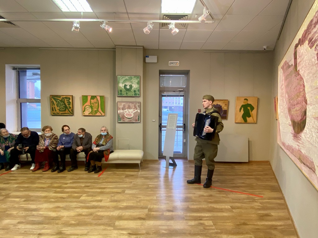 Евгений Бабурин, руководитель вокального ансамбля «Второе дыхание» концертно-досугового центра «Октябрь» выступил с музыкальными композициями военных лет. Песни звучали в унисон сюжетам картин Райшева «Вот кто-то с горочки спустился» и «У высоких берегов Амура часовые Родины стоят», а всеми любимую песню «Катюша» гости вернисажа спели вместе.