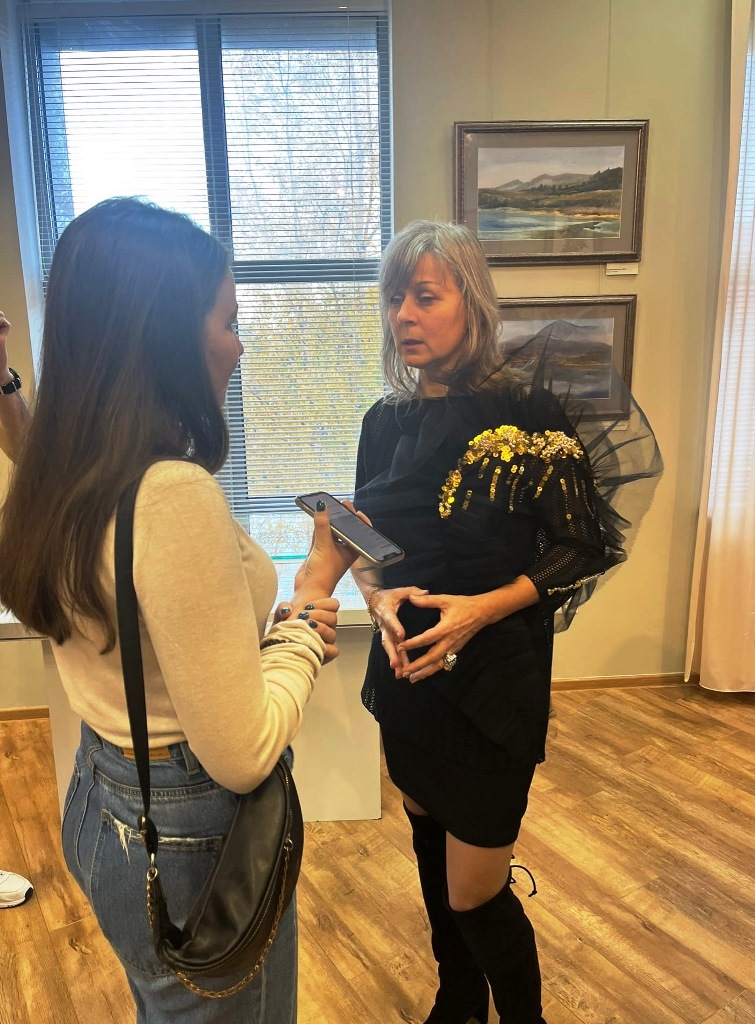 Еще одним приятным событием для Ирины Миклушевской стал визит на выставку Губернатора Ханты-Мансийского автономного округа – Югры Натальи Владимировны Комаровой. Наталья Владимировна, давний друг семьи Миклушевских, поздравила Ирину Николаевну с открытием и вручила памятный подарок – издание «Очерки истории Ханты-Мансийского автономного округа – Югры». Ирина Николаевна в свою очередь презентовала Наталье Владимировне шелковой платок с цветочным орнаментом, созданным собственноручно.
