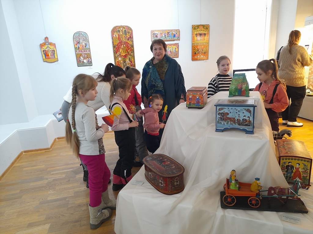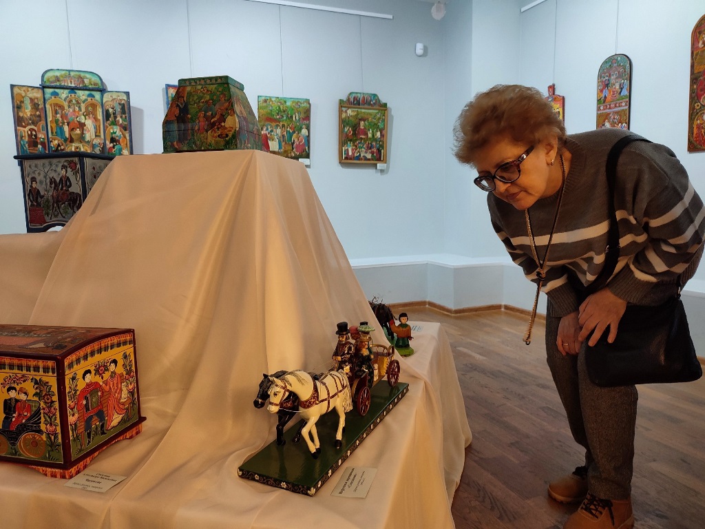 Расписные свадебные сундуки и ларцы, детские игрушки и сюжетные панно – все наполнено духом соборности и веры в то, что человеческое счастье обретается в семье. Отсюда в рисунках и обустроенность мира с нарядными домами и храмами, в которых крестят детей, лад гармоней и балалаек в руках статных парней, достоинство, с которым выступают нарядные девушки. Желание рассмотреть детали росписи уводит в дальнюю перспективу среднерусского ландшафта, где вдруг замечаешь забавную сценку с домашними животными или художника с мольбертом.
