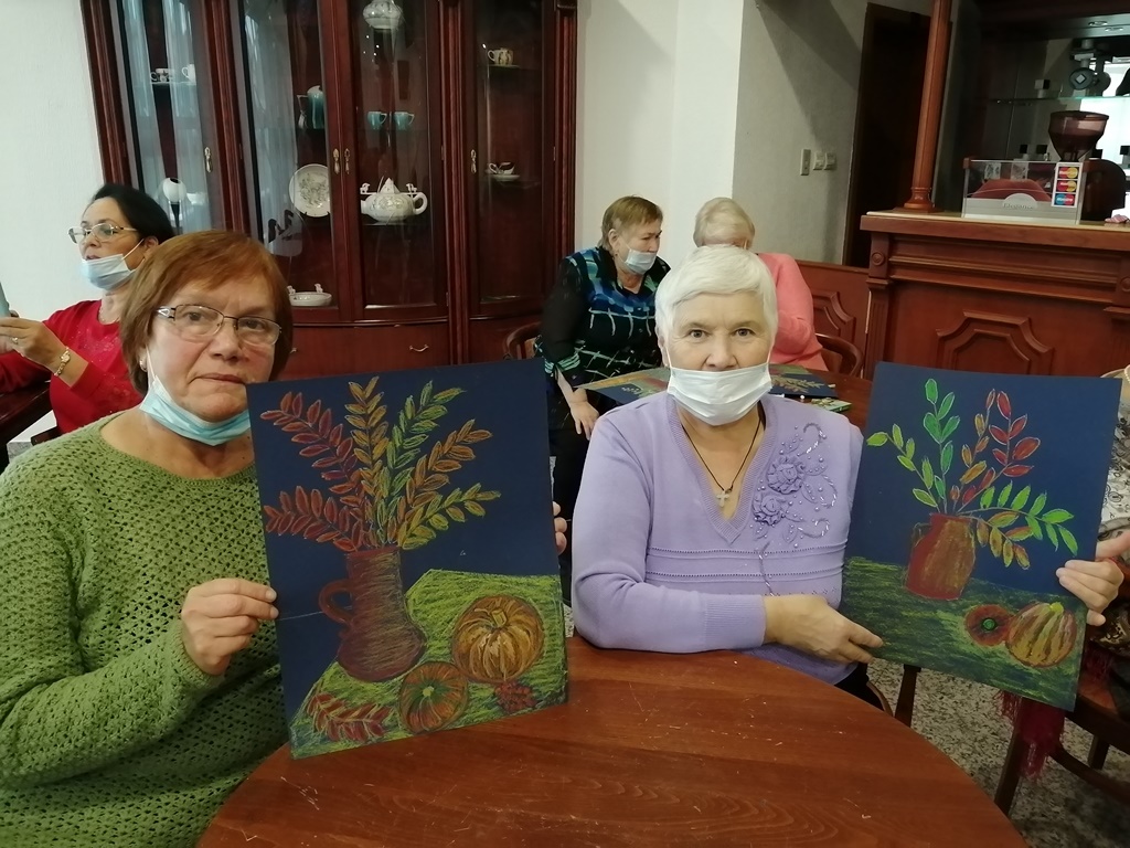 В продолжение мероприятия состоялся художественный мастер-класс «Осенний натюрморт». Участники создали яркие рисунки с изображением букета рябины и тыквой в технике масляной пастели.