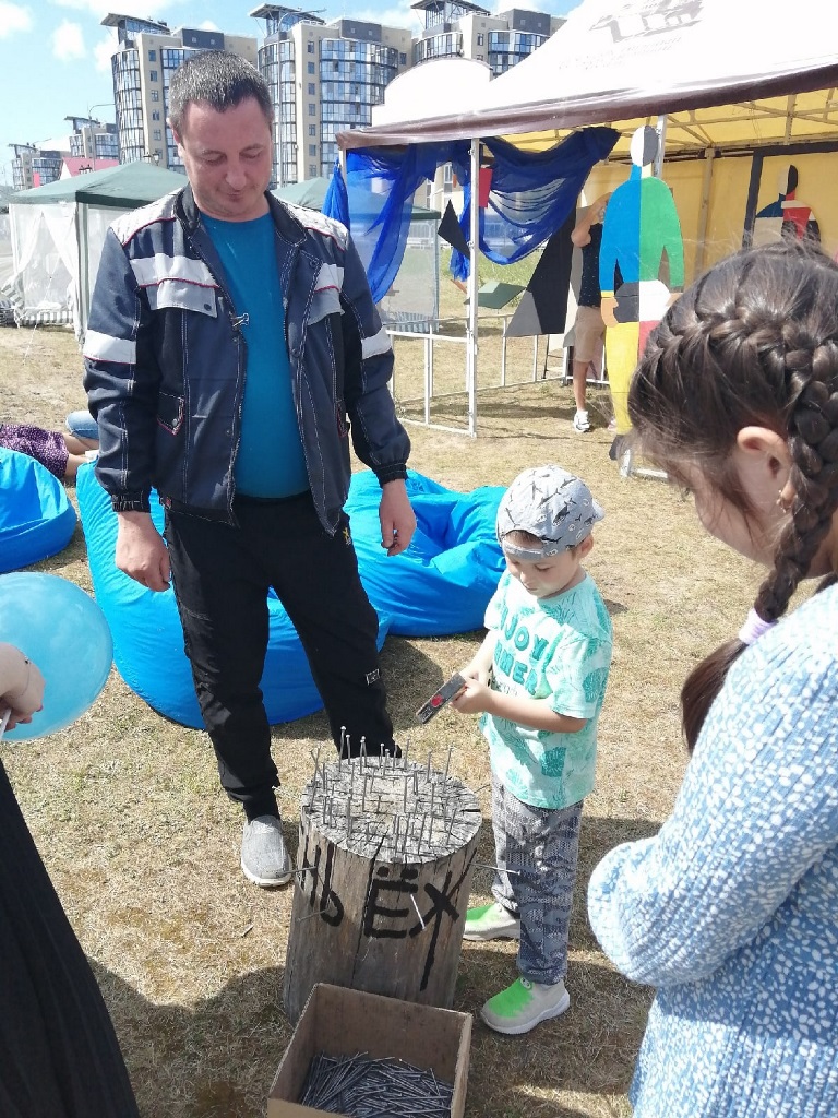 И ещё один любопытный момент. С виду обычный пенёк и набор из гвоздей и молотка вызвал восторг не только у детей, но и у их родителей. Чтобы забить металл в дерево, горожане выстроились в очередь. В итоге получился самый настоящий ёж. Вот что значит нетривиальный подход к искусству.