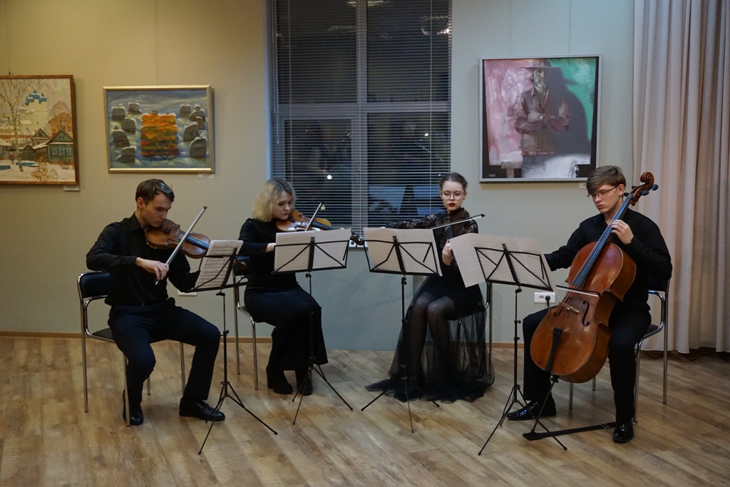 Открыли выставку студенты Центра искусств для одарённых детей Севера – квартет в составе Артура Гиндуллина, Елизаветы Редьковой, Софии Жолтиковой, Ивана Зимина. Ребята исполнили несколько классических музыкальных номеров, создав атмосферу праздника, которую отметили все гости.