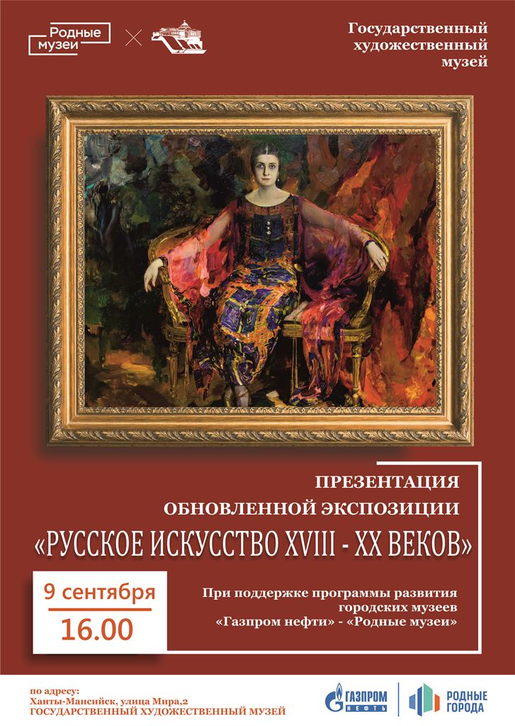 9 сентября в 16.00 в Государственном художественном музее состоится презентация обновленной экспозиции русского искусства XVIII-XX веков. Новое выставочное оборудование позволило Государственному художественному музею трансформировать пространство для создания более интересного экспозиционного решения, и увеличить выставочную площадь. Изменения произошли при поддержке программы развития региональных музеев «Родные музеи» компании «Газпром нефти», которую в Ханты-Мансийске реализует «Газпромнефть-Хантос». Главная задача проекта – трансформировать музеи в новые точки притяжения.