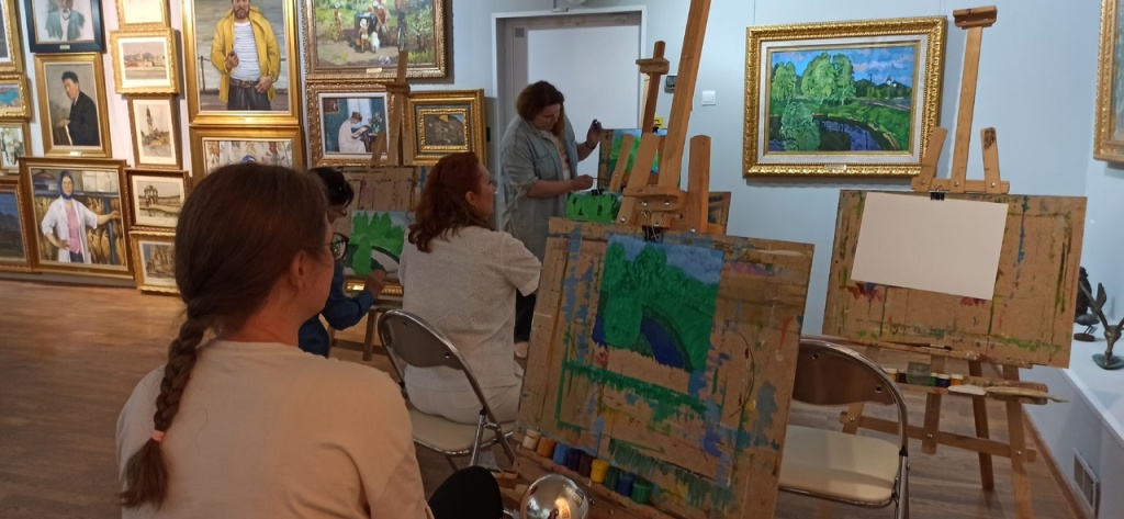 Во второй половине дня посетители художественных мастер-классов создали картину в технике гуаши по произведению художника Ю.В. Матушевского "Зеленый май", 1970г.