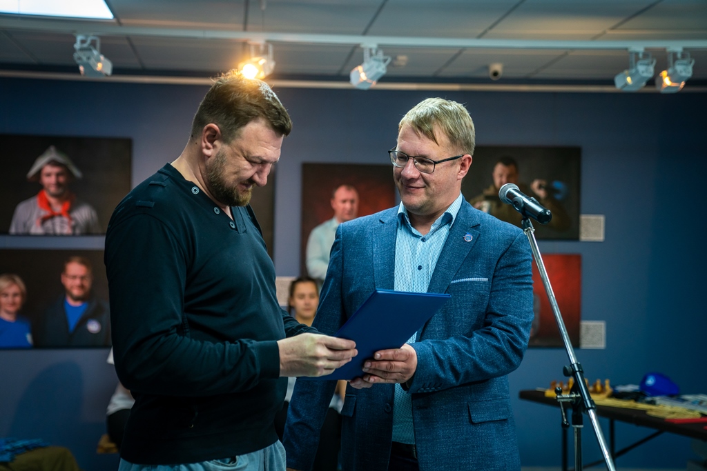 Под громкие аплодисменты гостей вернисажа Эдуард Борисович торжественно вручил Александру Иванову, начальнику лагеря гуманитарной миссии югорских добровольцев, благодарственное письмо Президента Российской Федерации В.В. Путина с формулировкой «за вклад в организацию и проведение гуманитарных миссий в условиях специальной военной операции».