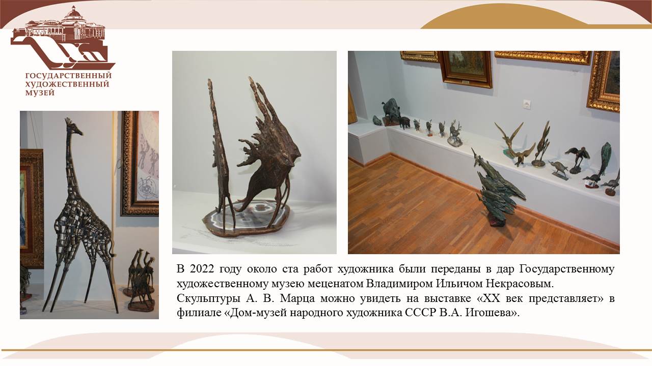 В 2022 году около ста работ художника были переданы музею в дар меценатом Владимиром Ильичом Некрасовым. Скульптуры А. В. Марца можно увидеть на выставке «XX век представляет» в филиале «Дом-музей народного художника СССР В.А. Игошева» (ул. Лопарева, 7).