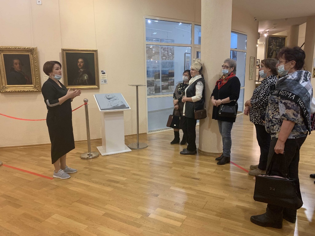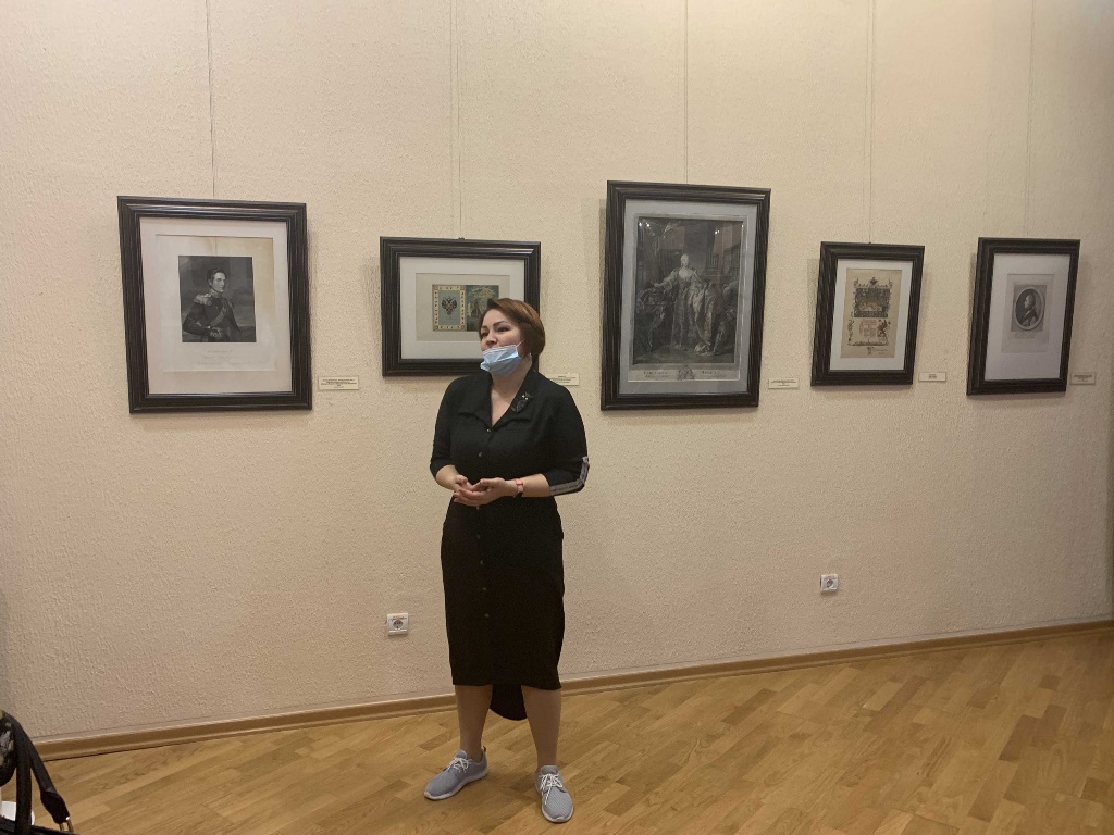 На экскурсии по выставке из фондов музея, посвященной 300-летию утверждения титула Императора Всероссийского, посетители познакомились с графическими произведениями XIX-XX веков – портерами Петра I, Николая I, Екатерины II, Елизаветы Петровны и гравюрами в жанре пейзажа-ведута с изображением императорских дворцов, а также бюстом Александра I.